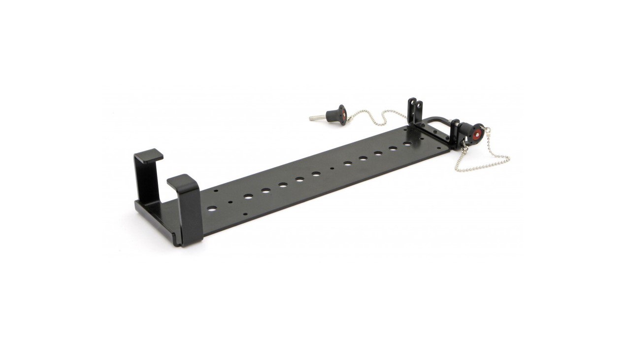 Diese Universalhalterung kann eingesetzt werden, um das Gerät auf beliebigen Plattformen oder in Traversensystemen zu montieren. Verschiedene Bohrungen sind bereits standardmäßig vorhanden. Ein Safety-Seil kann ebenfalls befestigt werden.