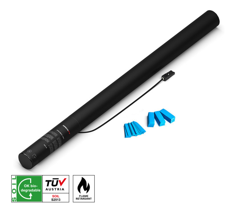 Mit diesem elektrischen Konfettischießer jagen Sie schwer entflammbares (B1) Konfetti in luftige Höhen. Diese 80-cm-Kanone feuert Konfetti bis zu 12 Meter weit. Die Farben sind alle vom TÜV als biologisch abbaubar zertifiziert. Setzen Sie die Kanone in ein FX Hardware-Gerät ein, und die Party kann losgehen, wenn Sie auf die Taste drücken oder den Abzug betätigen. Sollten Sie bisher keine elektrische Abschussrampe besitzen, schauen Sie sich gern die Auswahl in unserem Shop an.