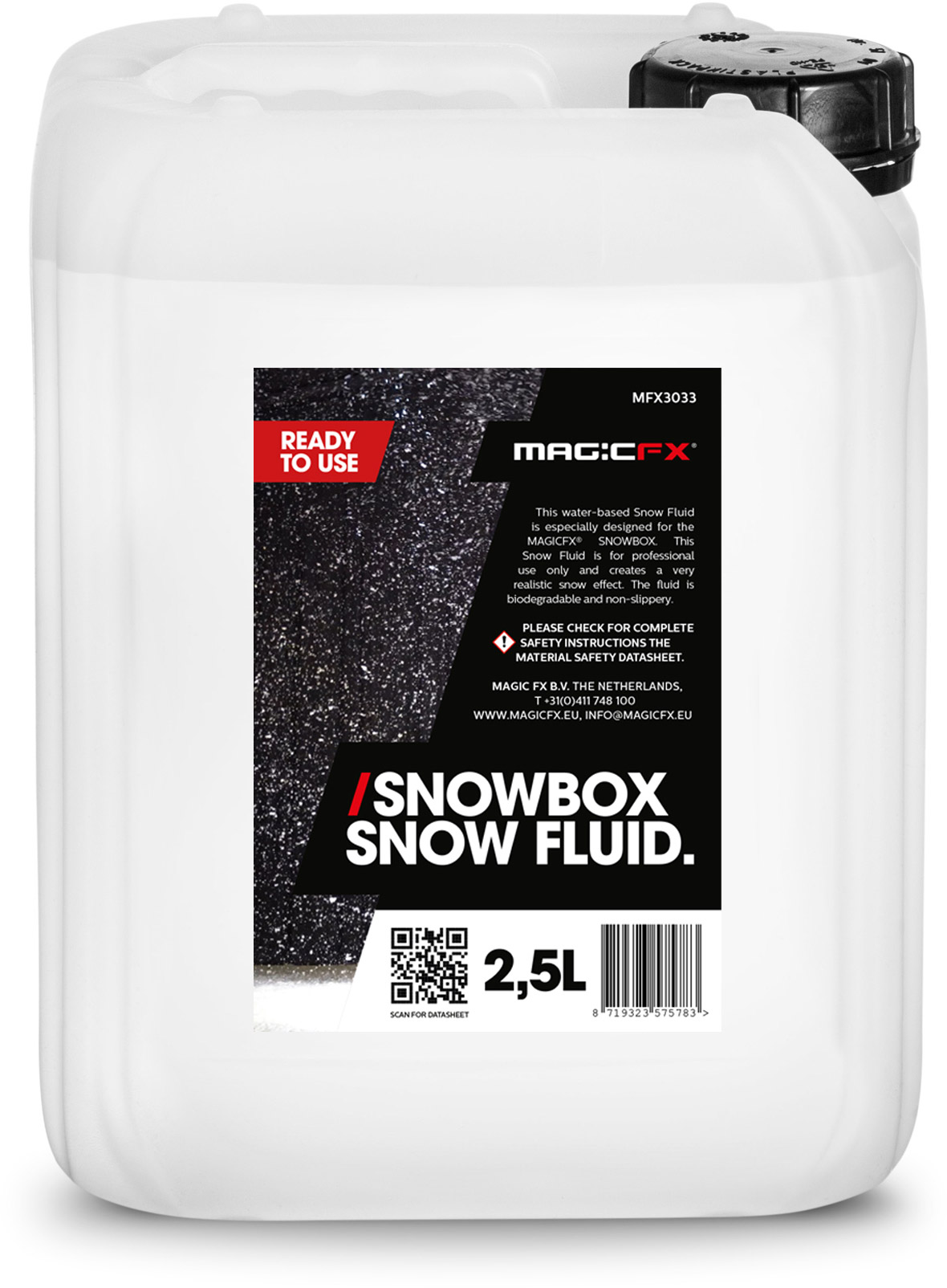 Dieses Schneefluid auf Wasserbasis ist speziell für die MAGIC FX SNOWBOX entwickelt worden. Dieses Schnee-Fluid ist nur für den professionellen Gebrauch bestimmt und erzeugt einen sehr realistischen Schnee-Effekt. Das Fluid ist biologisch abbaubar und nicht rutschig.