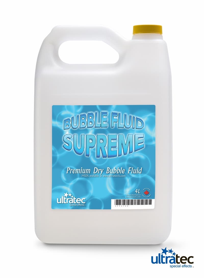 Ultratec FX Bubble Fluid Supreme 4L It is a Supreme Water Base Bubble Fluid that produces a large quantity of bubbles that are drier and longer lasting that does not produce a residue. This fluid is used in Ultratec’s Bubble Master and the Bubble Master Junior.