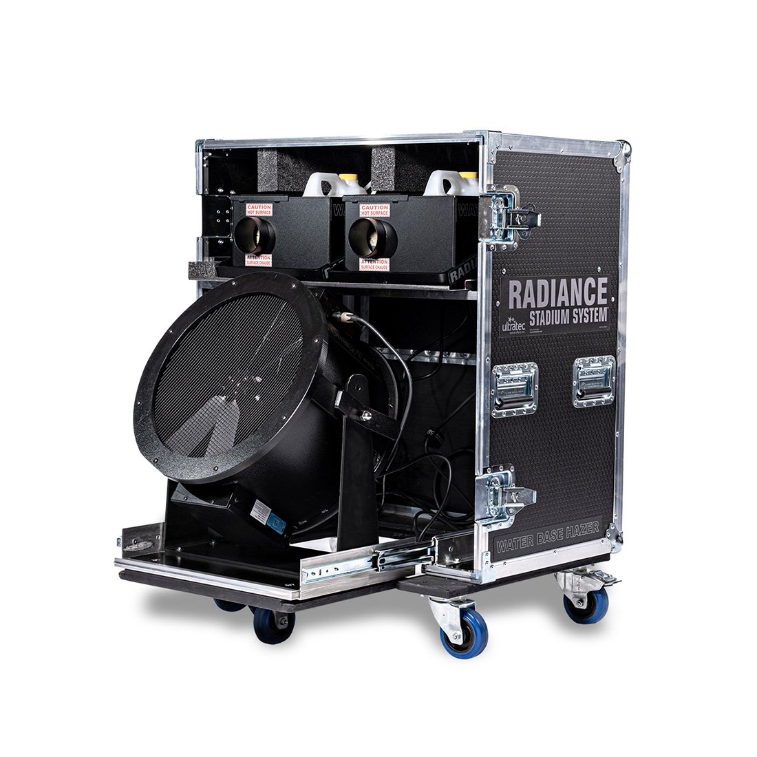 Es ist in einem robusten Case auf Rädern verpackt und enthält zwei Radiance Hazer mit unserem preisgekrönten 4-Port Rapid Vaporizer. Dies ist ein großer Fortschritt in der wasserbasierten Dunsttechnologie.